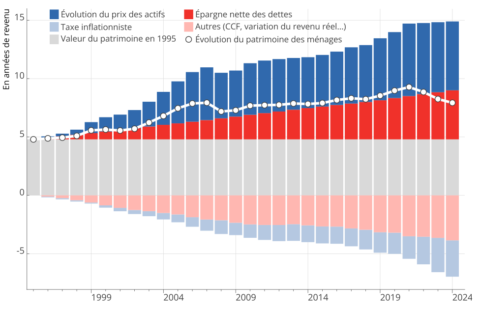 Patrimoine net des ménages depuis 30 ans : un gain de 3 années de revenu malgré la hausse de la taxe inflationniste depuis 2022