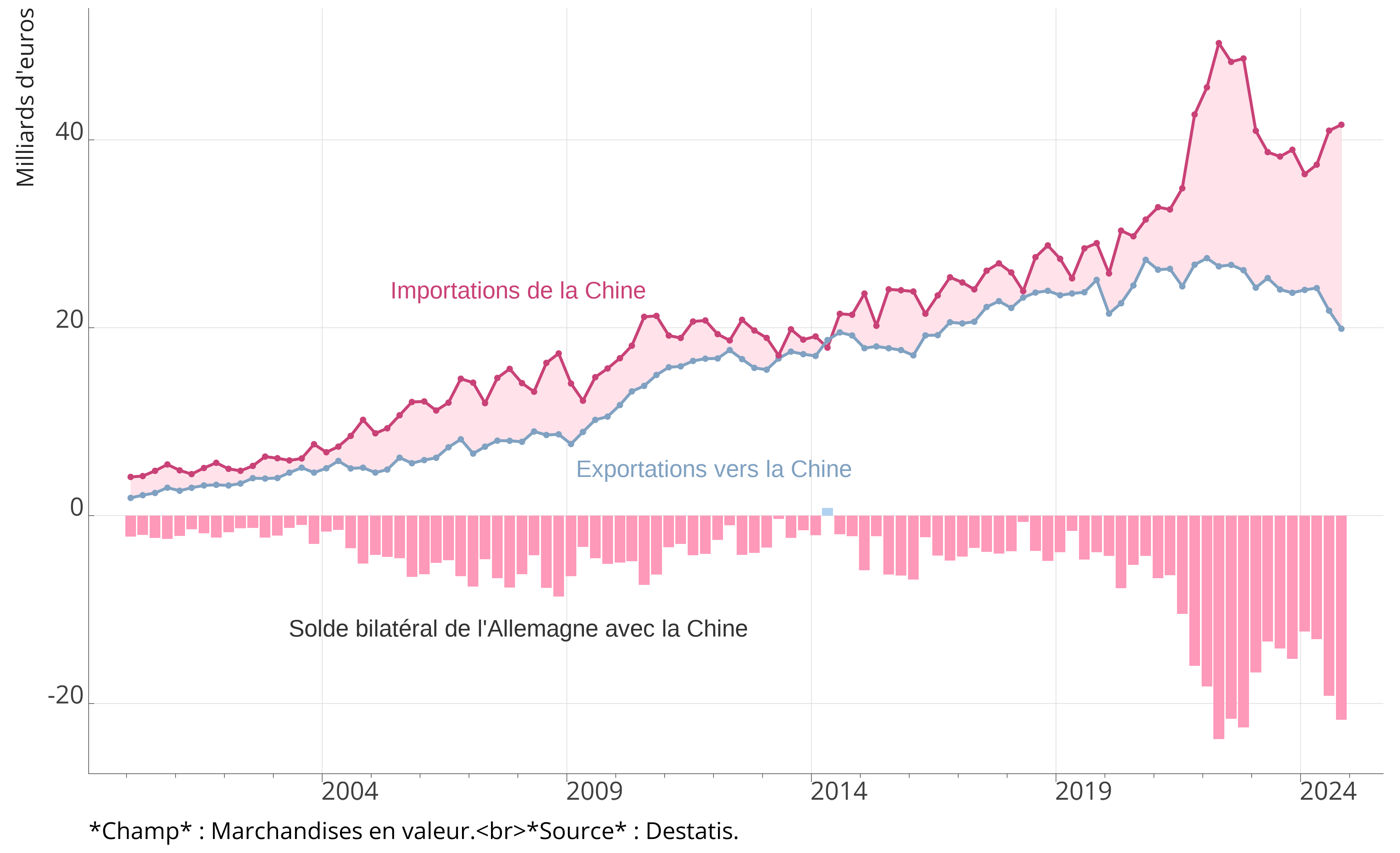 Although public consumption increased significantly (+3.5% in 2024), private household consumption expenditures remained limited, increasing by only 0.3% in 2024, despite the sustained growth in real disposable income (+1.5% in 2024), driven by dynamic real wages (+2.9%). Thus, households preferred to save due to economic uncertainty and a gloomy employment outlook marked by an increase in the unemployment rate; the savings rate increased by one point to 11.4% in 2024. In 2024, strong wage growth and weakening productivity led to a significant increase in real unit labor costs. However, this is actually a normalization, given the past declines in real wages linked to the resurgence of inflation.2 On the private investment front, gross fixed capital formation (GFCF) contracted by 2.6% in 2024, with a particularly sharp decline in investment in machinery and equipment (-5.1% in 2024). In the construction sector, GFCF also fell by 3.2% in 2024; however, the fourth quarter showed an increase, partly due to favorable weather conditions. In 2024, the contribution of foreign trade to German growth was strongly negative (-0.6 percentage points), mainly due to a decline in exports. Thus, in the fourth quarter of 2024, exports of goods and services decreased significantly (-2.2%) compared to the third quarter of 2024, despite strong global demand. This is due to the loss of competitiveness of German industry, particularly vis-à-vis China: in 2024, goods exports to China were 20% lower than their 2019 level (figure 1). Furthermore, the divergence is growing between the evolution of gross value added in volume in manufacturing and in the services sector. In the fourth quarter of 2024, the value added of manufacturing decreased by 0.6%, marking the seventh consecutive decline.