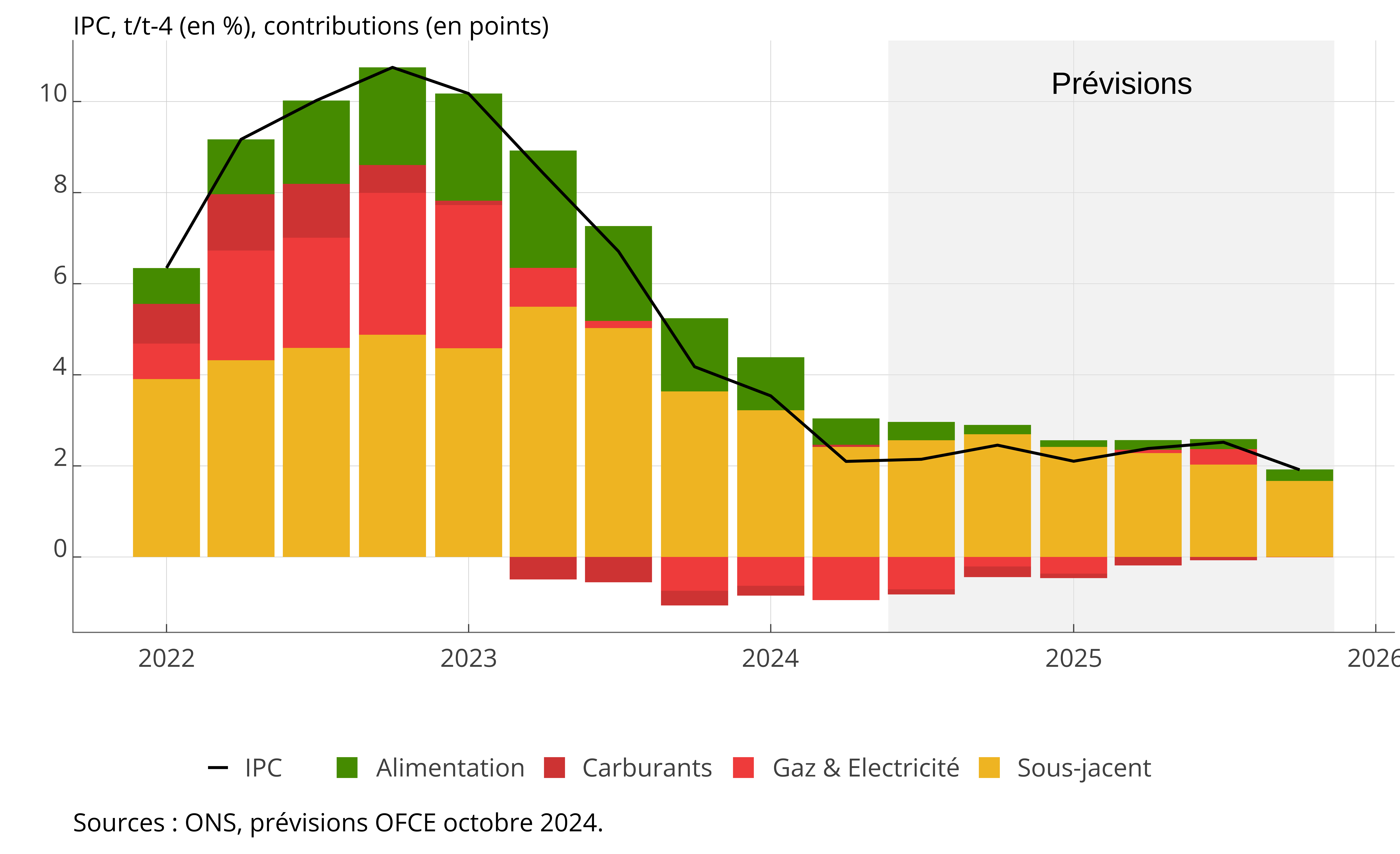Les relèvements du taux directeur de la Banque d’Angleterre, de 0,1 % en novembre 2021 à 5,25 % en août 2023 et leur maintien à ce niveau pendant un an, destinés à ramener l’inflation vers 2 %, dans une économie sortie de la crise COVID avec un taux de chômage faible et des tensions sur le marché du travail, ont freiné l’activité, alors que le soutien budgétaire s’amenuisait. La hausse des prix à la consommation, qui avait atteint 10,8 % au quatrième trimestre 2022 (contre 10 % pour l’ensemble de la zone euro et 7 % aux Etats-Unis), n’était plus que de 2,2 % en août 2024.