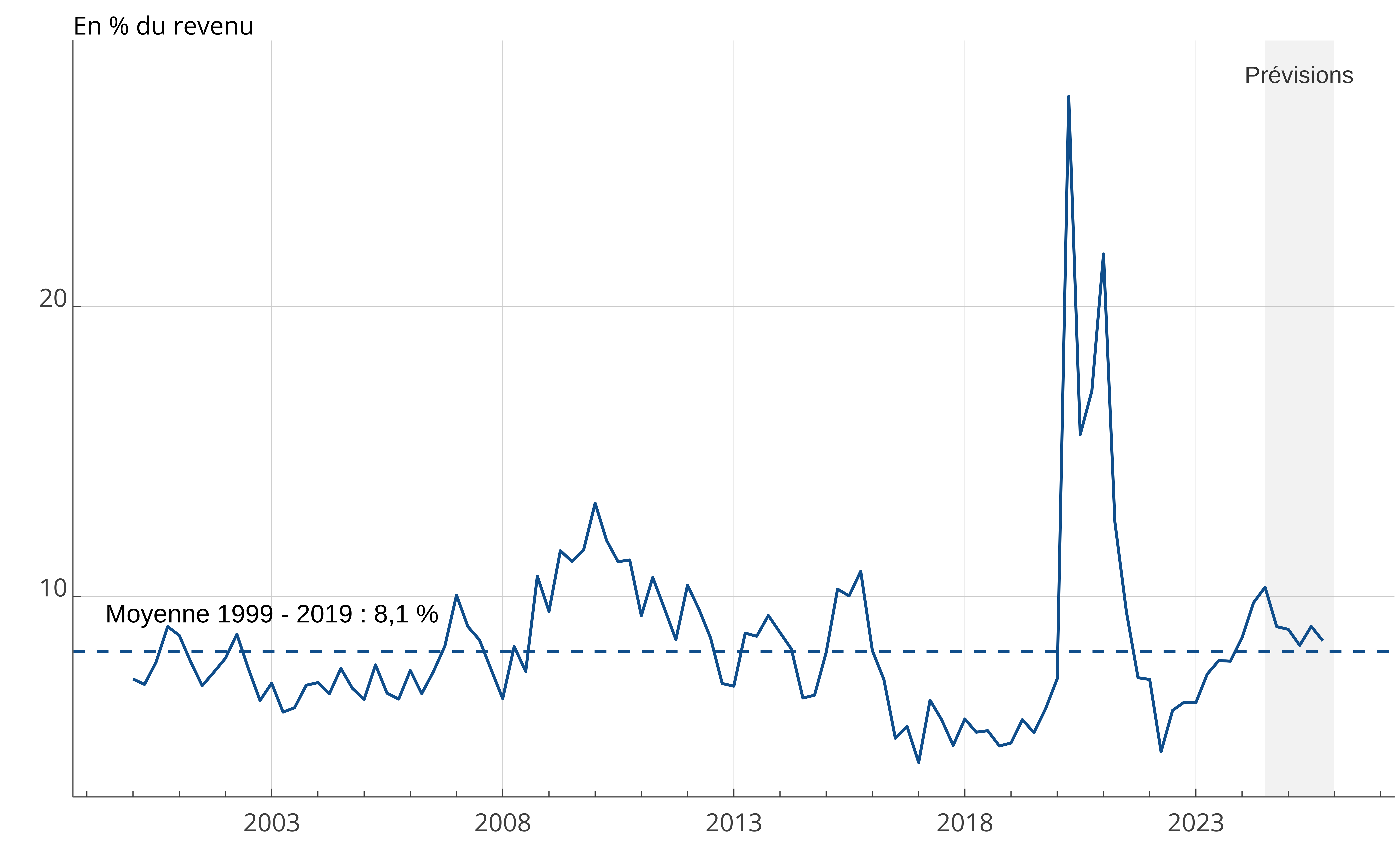 Au second semestre 2024, la consommation des ménages progresserait comme le revenu : le ralentissement des prix permettrait une hausse du pouvoir d’achat. La baisse des taux d’intérêt a commencé à alléger le coût des emprunts, ce qui devrait faciliter une légère reprise de l’investissement en logement, alors que les prix de l’immobilier ont recommencé à croître. Cependant, la remontée du taux de chômage, qui atteindrait 4,9 % au quatrième trimestre 2025, sous nos hypothèses de croissance, de stabilité des taux d’activité et de gains de productivité horaire de près de 1 % en rythme annuel, pourrait freiner la consommation des ménages. Le retour d’une inflation comprise entre 2 et 2,5 % réduirait cependant le besoin de constituer une épargne destinée à limiter l’érosion des patrimoines due à l’accélération de l’inflation. Au total, dans notre prévision, le taux d’épargne baisserait d’environ 1 point, fluctuant autour de 8,7 % en 2025, ce qui le ramènerait près de sa moyenne de longue période.