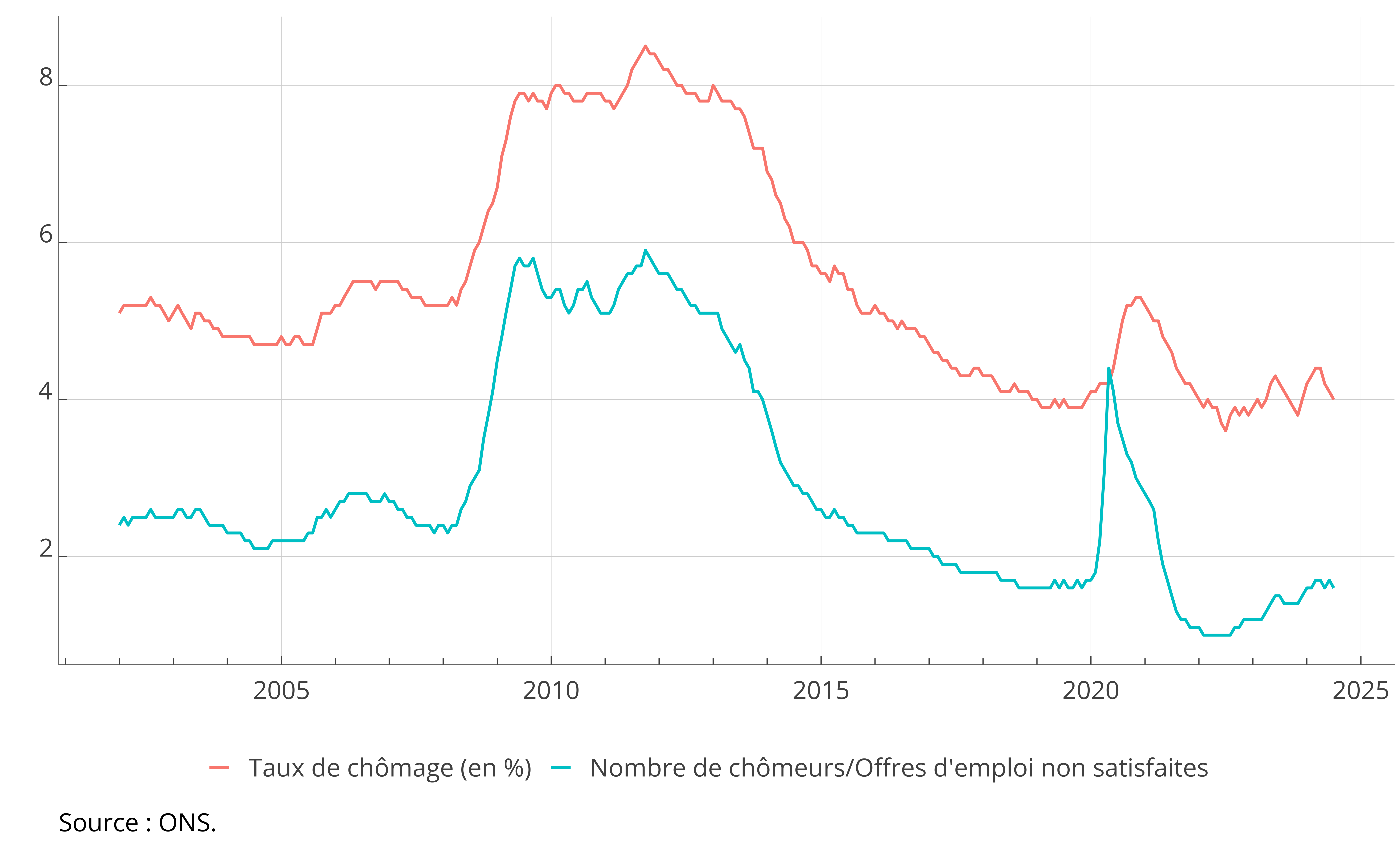 Le taux de chômage (au sens du BIT) avait atteint un point bas à 3,6 % en août 2022. Il a ensuite légèrement remonté et fluctué entre 3,8 % et 4,3 % ; il était de 4 % en juillet 2024, proche de son niveau d’avant crise COVID. Mais le taux d’activité des 16-64 ans, qui avait atteint un point haut avant le début de la crise COVID (à 79,5 %) a baissé ensuite jusqu’à 77,8 % en janvier 2024, reflétant pour partie des retraits du marché du travail pour des raisons de santé (COVID longs). Cependant, le taux d’activité s’est stabilisé au premier trimestre 2024 et était légèrement remonté à 78,2 % en juillet. Les offres d’emplois non satisfaites, qui avaient fortement augmenté à la sortie de la crise COVID et atteint un pic à 1,3 million au printemps 2022, ont nettement baissé depuis. Elles n’étaient plus que de 857000 en juillet, une situation proche, en termes de nombre de chômeurs par emploi vacant, de celle d’avant le début de la crise COVID (graphique 2). Au deuxième trimestre 2024, l’emploi total était en baisse de 0,2 en glissement sur un an, alors que la valeur ajoutée était en hausse de 0,8 %. Le cycle de productivité n’était pas complètement refermé, au regard d’une tendance de longue période de 0,89 % par an.
