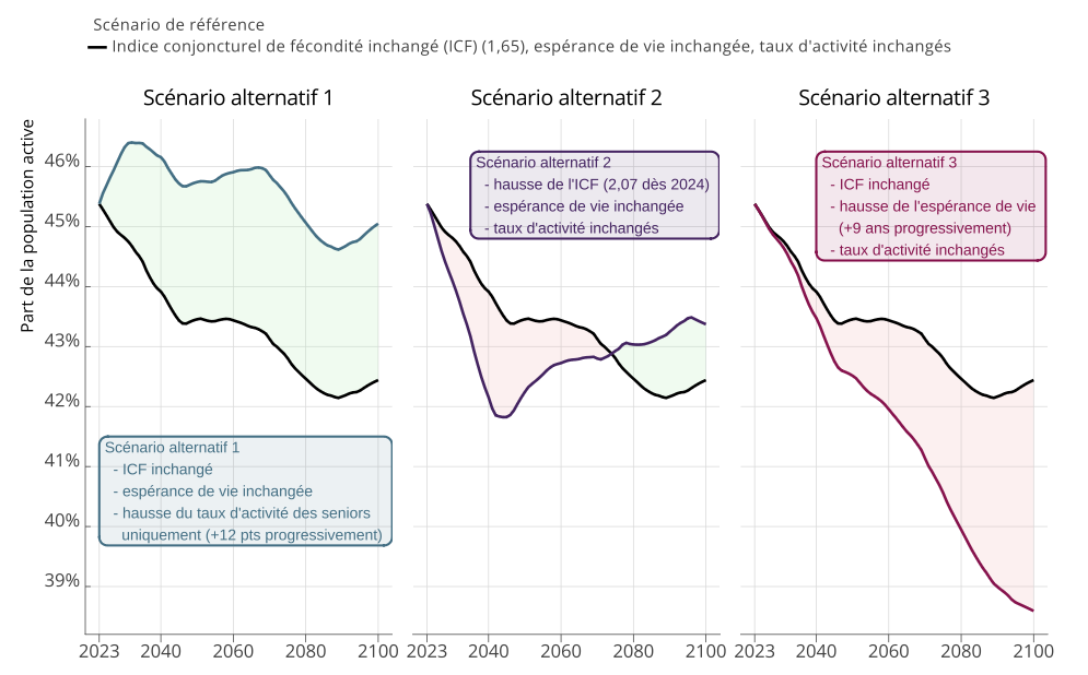 La réforme 2023 relève progressivement l’âge légal jusqu’à 64 ans et augmente la population active, mais sa suspension dans la LFSS 2026 (gel à 62 ans et 9 mois jusqu’à janvier 2028) en réduit une partie, surtout en 2027 ; on présente donc une variante de population active tendancielle pour 2026–2027.