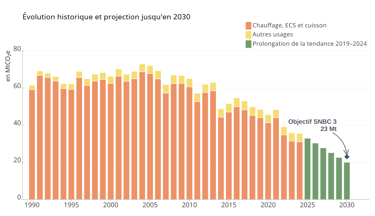 Le secteur du logement résidentiel a réduit les émissions de CO2 davantage que ce que prévoyait la deuxième stratégie nationale bas carbone (SNBC2) publiée en 2020. De fait, depuis 2019, les émissions de CO2 du logement résidentiel diminuent régulièrement. Elles sont passées de 48,5 millions de tonnes (Mt) en 2019 à 35,5 Mt en 2024 (cf. graphique ci-dessous), soit une tendance à la baisse de 2,6 Mt par an.