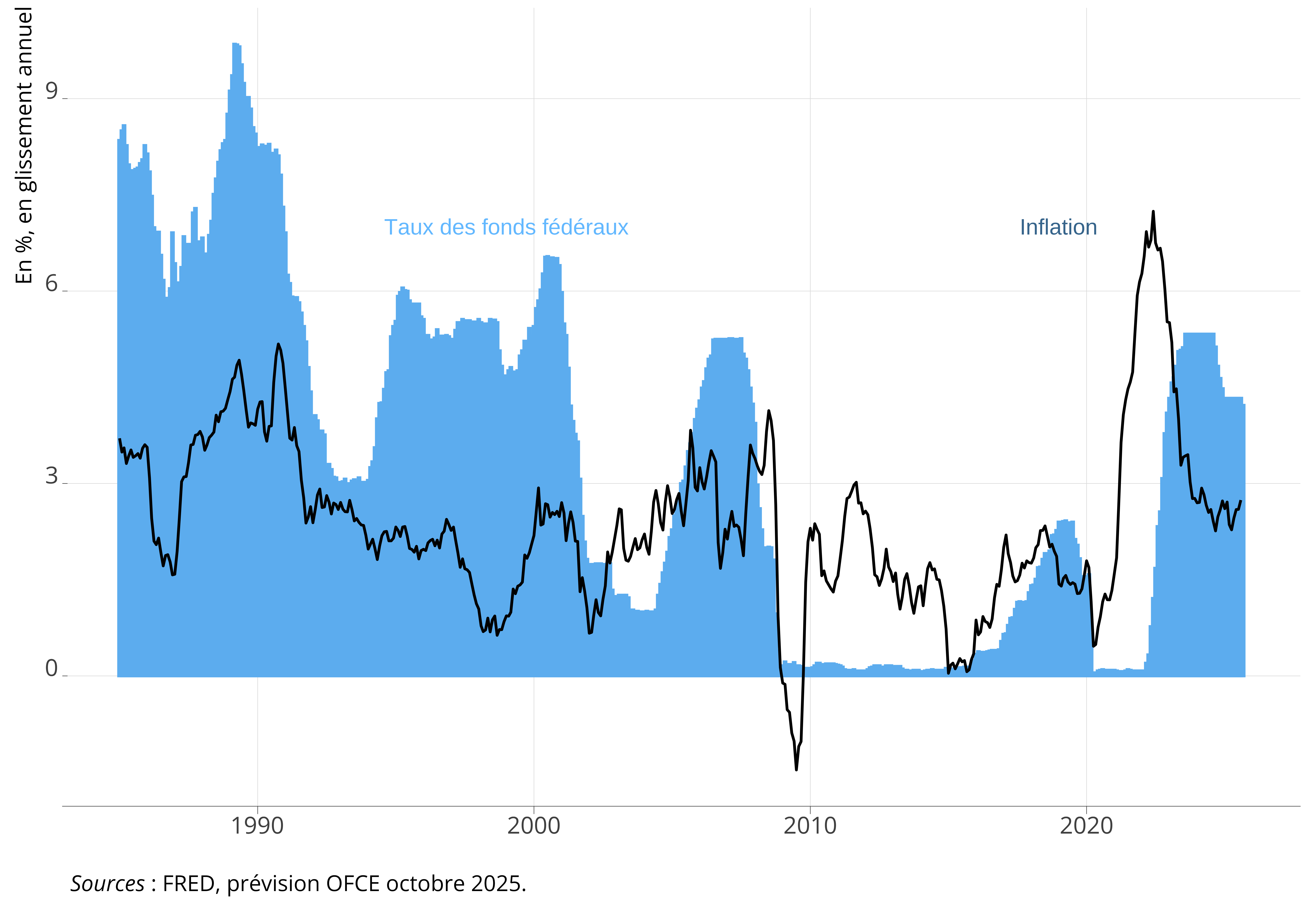 Aux États-Unis, l’enquête réalisée par la Réserve fédérale de Philadelphie auprès des prévisionnistes (Survey of Professional Forecasters, SPF) montre un déplacement marqué de la distribution des anticipations pour 2026 entre l’enquête réalisée au quatrième trimestre 2024 et celle du troisième trimestre 2025. La probabilité associée à des niveaux d’inflation supérieurs à 3 % s’est accrue de manière notable, traduisant une perception plus forte des risques inflationnistes. Cette révision à la hausse peut refléter plusieurs facteurs anticipés par les professionnels : hausse des droits de douane et impact de la guerre commerciale sur biens importés, expansion budgétaire ainsi que les incertitudes entourant l’orientation de la politique monétaire, voire l’indépendance de la Réserve fédérale.